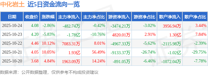 证券之星消息,截至2025年10月24日收盘,中化岩土(002542)报收于4.08元,下跌2.86%,换手率16.1%,成交量283.13万手,成交额11.49亿元。