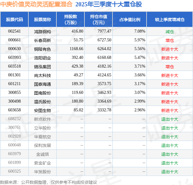 中庚价值灵动灵活配置混合的前十大重仓股如下: