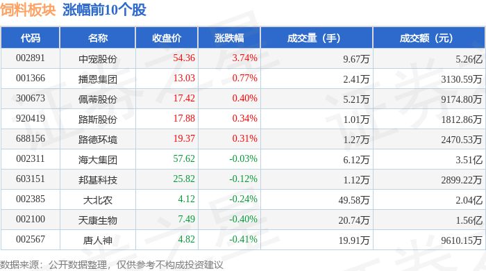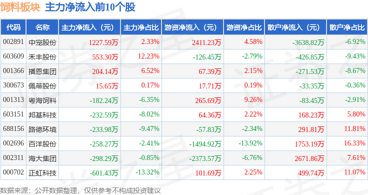 从资金流向上来看,当日饲料板块主力资金净流出1.54亿元,游资资金净流入5579.44万元,散户资金净流入9774.24万元。饲料板块个股资金流向见下表:
