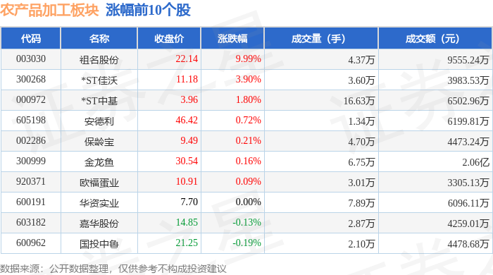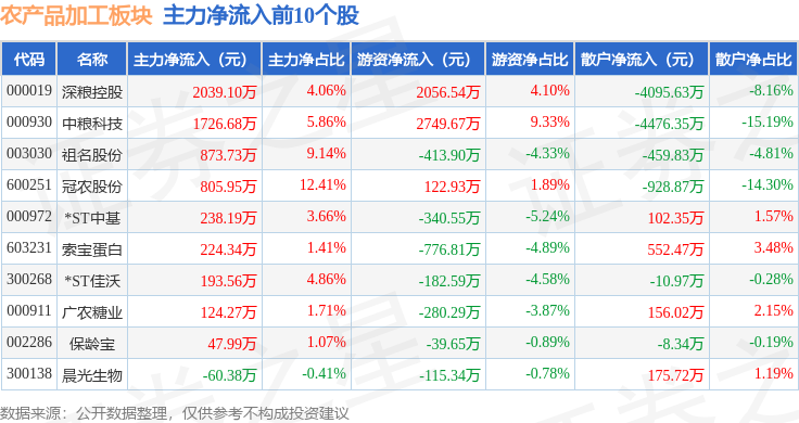 从资金流向上来看,当日农产品加工板块主力资金净流出5406.94万元,游资资金净流入1.02亿元,散户资金净流出4812.51万元。农产品加工板块个股资金流向见下表: