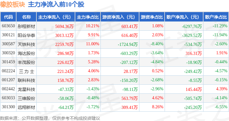从资金流向上来看,当日橡胶板块主力资金净流入7934.72万元,游资资金净流出1614.88万元,散户资金净流出6319.84万元。橡胶板块个股资金流向见下表: