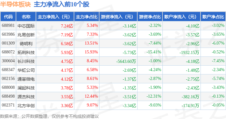 从资金流向上来看,当日半导体板块主力资金净流入95.13亿元,游资资金净流出54.84亿元,散户资金净流出40.28亿元。半导体板块个股资金流向见下表: