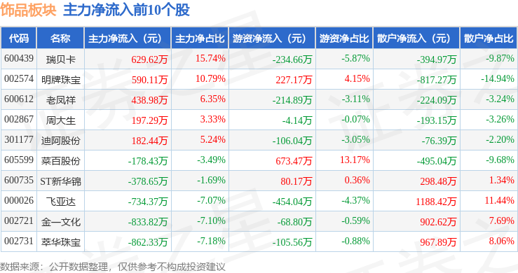 从资金流向上来看,当日饰品板块主力资金净流出1.17亿元,游资资金净流出3223.21万元,散户资金净流入1.49亿元。饰品板块个股资金流向见下表: