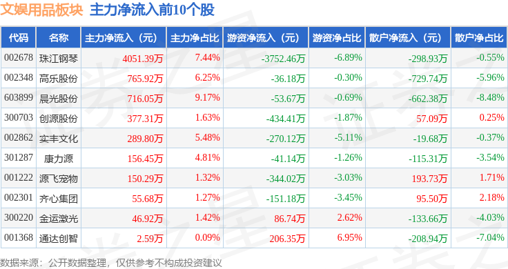 从资金流向上来看,当日文娱用品板块主力资金净流出4399.77万元,游资资金净流出909.98万元,散户资金净流入5309.75万元。文娱用品板块个股资金流向见下表: