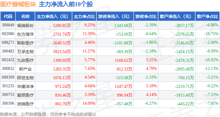 从资金流向上来看,当日医疗器械板块主力资金净流出6.54亿元,游资资金净流入1.99亿元,散户资金净流入4.55亿元。医疗器械板块个股资金流向见下表: