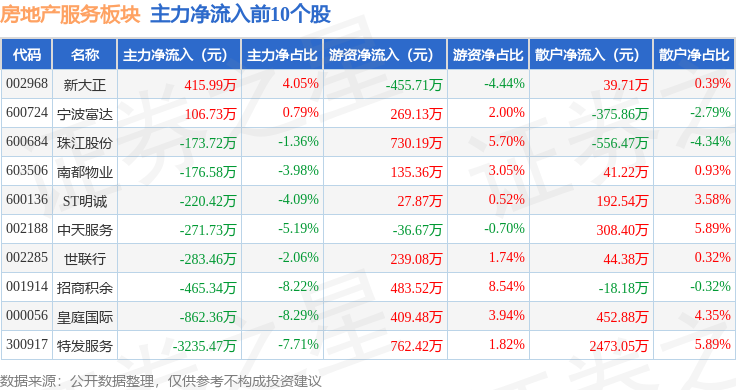 从资金流向上来看,当日房地产服务板块主力资金净流出1.03亿元,游资资金净流入4377.49万元,散户资金净流入5901.39万元。房地产服务板块个股资金流向见下表: