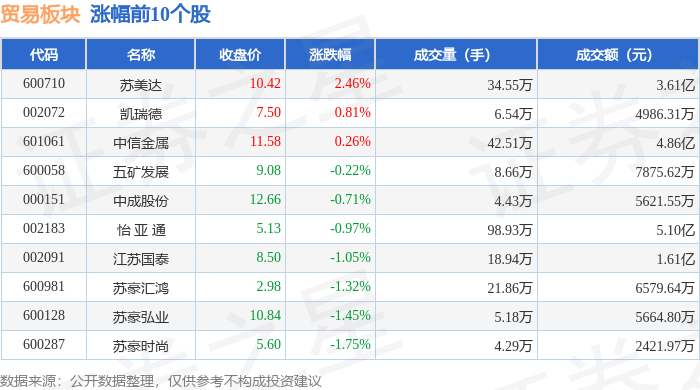 证券之星消息,10月24日贸易板块较上一交易日下跌0.66%,东方创业领跌。当日上证指数报收于3950.31,上涨0.71%。深证成指报收于13289.18,上涨2.02%。贸易板块个股涨跌见下表: