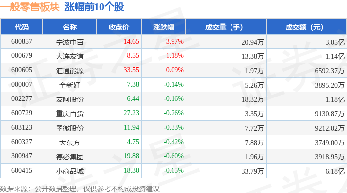 从资金流向上来看,当日一般零售板块主力资金净流出9.56亿元,游资资金净流入1.37亿元,散户资金净流入8.2亿元。一般零售板块个股资金流向见下表: