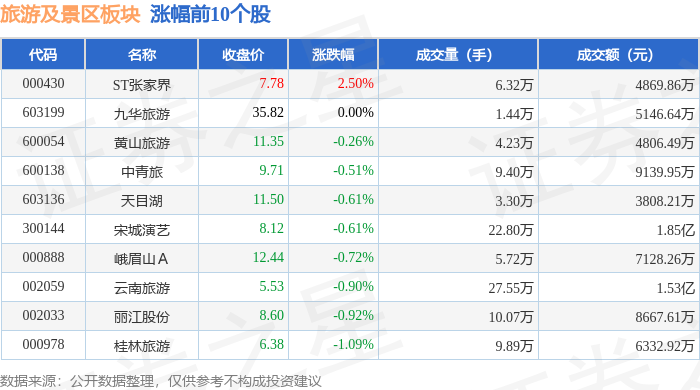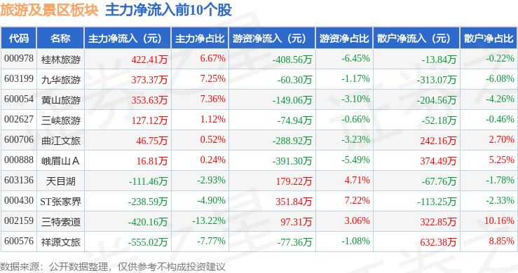 从资金流向上来看,当日旅游及景区板块主力资金净流出3.49亿元,游资资金净流入313.2万元,散户资金净流入3.45亿元。旅游及景区板块个股资金流向见下表: