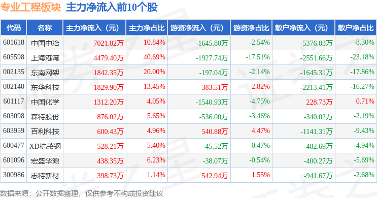 从资金流向上来看,当日专业工程板块主力资金净流出7983.31万元,游资资金净流出554.45万元,散户资金净流入8537.76万元。专业工程板块个股资金流向见下表: