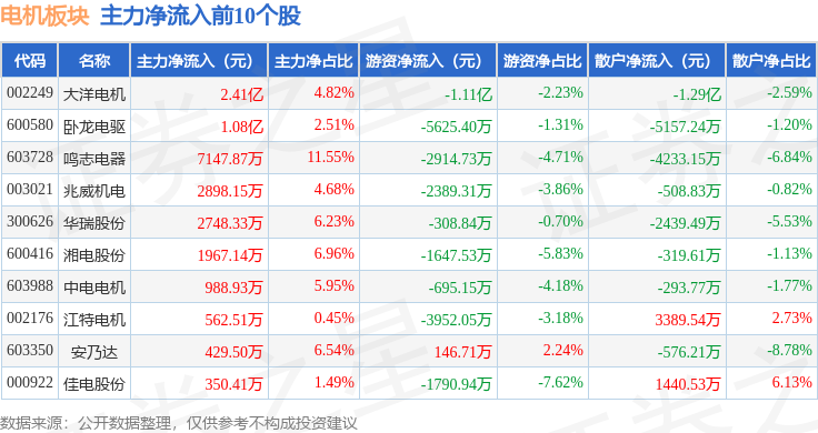 从资金流向上来看,当日电机板块主力资金净流入4.63亿元,游资资金净流出3.42亿元,散户资金净流出1.21亿元。电机板块个股资金流向见下表: