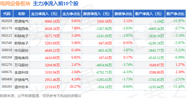 从资金流向上来看,当日电网设备板块主力资金净流入1.01亿元,游资资金净流出2.85亿元,散户资金净流入1.84亿元。电网设备板块个股资金流向见下表: