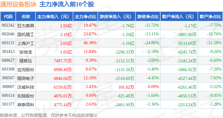 从资金流向上来看,当日通用设备板块主力资金净流入4.47亿元,游资资金净流出7.41亿元,散户资金净流入2.94亿元。通用设备板块个股资金流向见下表: