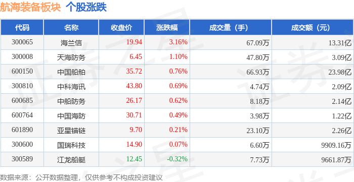 证券之星消息,10月24日航海装备板块较上一交易日上涨0.8%,海兰信领涨。当日上证指数报收于3950.31,上涨0.71%。深证成指报收于13289.18,上涨2.02%。航海装备板块个股涨跌见下表: