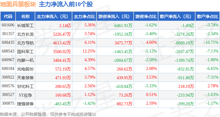 从资金流向上来看,当日地面兵装板块主力资金净流入3.64亿元,游资资金净流出6945.47万元,散户资金净流出2.95亿元。地面兵装板块个股资金流向见下表: