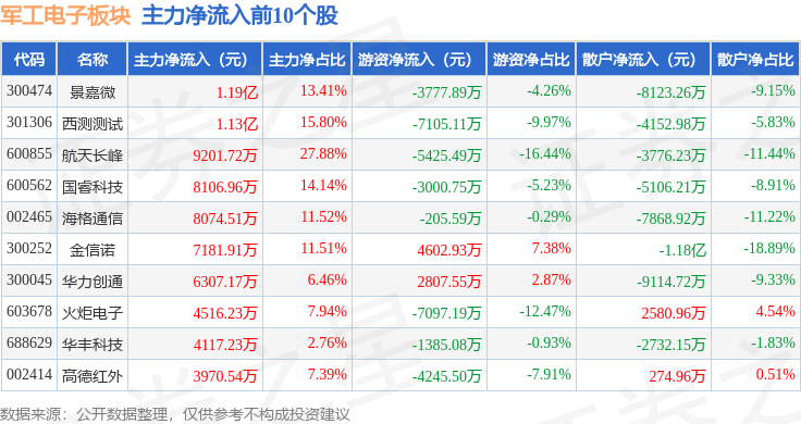 从资金流向上来看,当日军工电子板块主力资金净流入8.45亿元,游资资金净流出4.9亿元,散户资金净流出3.55亿元。军工电子板块个股资金流向见下表: