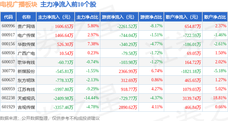从资金流向上来看,当日电视广播板块主力资金净流出5.1亿元,游资资金净流入2.08亿元,散户资金净流入3.02亿元。电视广播板块个股资金流向见下表: