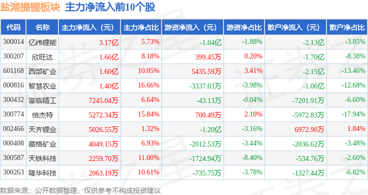 从资金流向上来看,当日盐湖提锂板块主力资金净流出4194.13万元,游资资金净流入4019.89万元,散户资金净流入174.25万元。盐湖提锂板块个股资金流向见下表:
