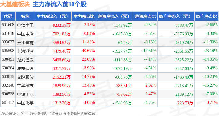 从资金流向上来看,当日大基建板块主力资金净流出12.58亿元,游资资金净流入4.74亿元,散户资金净流入7.84亿元。大基建板块个股资金流向见下表: