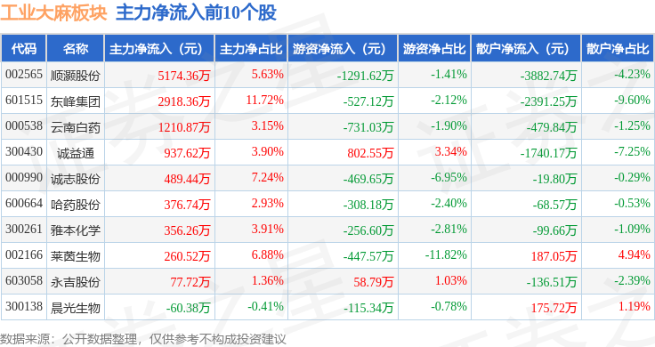 从资金流向上来看,当日工业大麻板块主力资金净流出2.66亿元,游资资金净流入6843.71万元,散户资金净流入1.98亿元。工业大麻板块个股资金流向见下表: