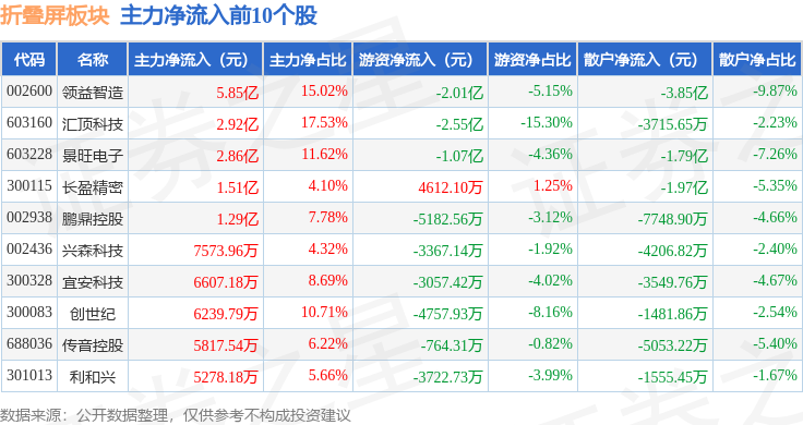 从资金流向上来看,当日折叠屏板块主力资金净流入8.1亿元,游资资金净流出5.72亿元,散户资金净流出2.38亿元。折叠屏板块个股资金流向见下表: