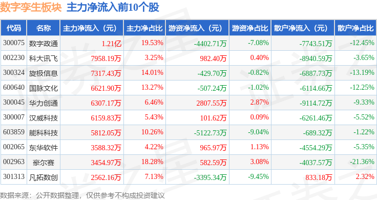 从资金流向上来看,当日数字孪生板块主力资金净流入4.37亿元,游资资金净流出1.59亿元,散户资金净流出2.78亿元。数字孪生板块个股资金流向见下表: