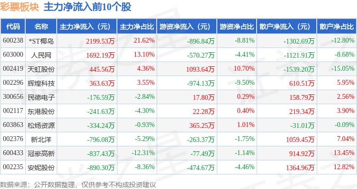 从资金流向上来看,当日彩票板块主力资金净流出1.79亿元,游资资金净流出79.0万元,散户资金净流入1.8亿元。彩票板块个股资金流向见下表: