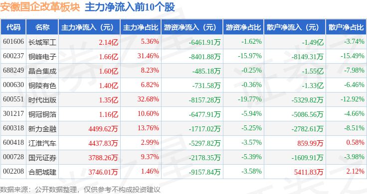 从资金流向上来看,当日安徽国企改革板块主力资金净流入11.08亿元,游资资金净流出4.73亿元,散户资金净流出6.35亿元。安徽国企改革板块个股资金流向见下表: