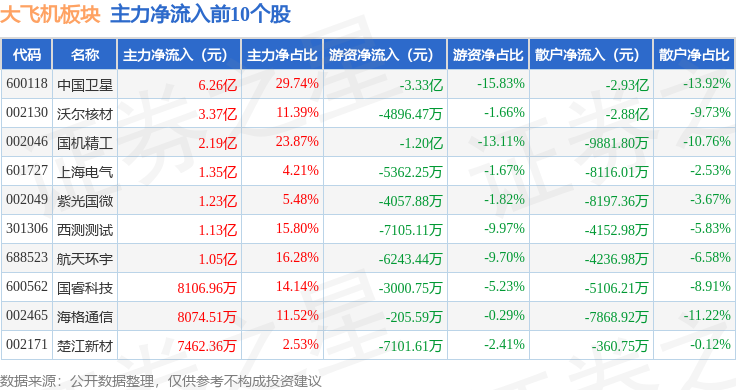 从资金流向上来看,当日大飞机板块主力资金净流入23.52亿元,游资资金净流出12.58亿元,散户资金净流出10.94亿元。大飞机板块个股资金流向见下表: