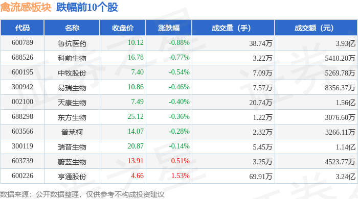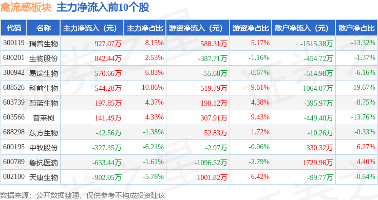 从资金流向上来看,当日禽流感板块主力资金净流入194.24万元,游资资金净流入2276.39万元,散户资金净流出2470.63万元。禽流感板块个股资金流向见下表: