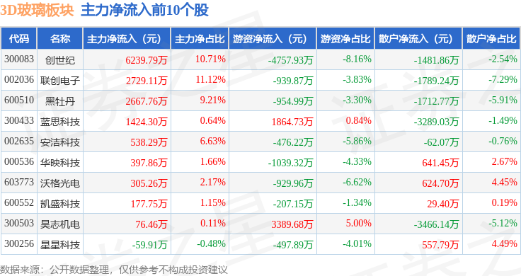 从资金流向上来看,当日3D玻璃板块主力资金净流出3.94亿元,游资资金净流入629.67万元,散户资金净流入3.87亿元。3D玻璃板块个股资金流向见下表:
