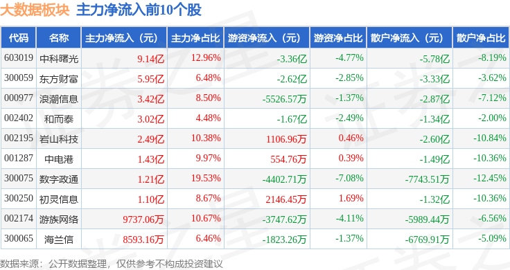 从资金流向上来看,当日大数据板块主力资金净流入6.11亿元,游资资金净流出5.37亿元,散户资金净流出7363.99万元。大数据板块个股资金流向见下表: