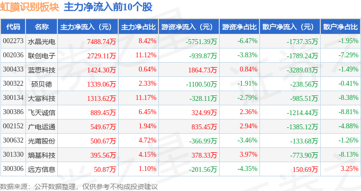 从资金流向上来看,当日虹膜识别板块主力资金净流入5239.17万元,游资资金净流出8762.17万元,散户资金净流入3522.99万元。虹膜识别板块个股资金流向见下表: