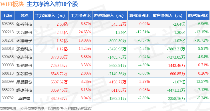 从资金流向上来看,当日WiFi板块主力资金净流入8.89亿元,游资资金净流出4.1亿元,散户资金净流出4.79亿元。WiFi板块个股资金流向见下表: