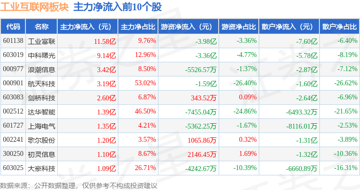从资金流向上来看,当日工业互联网板块主力资金净流入32.0亿元,游资资金净流出14.44亿元,散户资金净流出17.55亿元。工业互联网板块个股资金流向见下表: