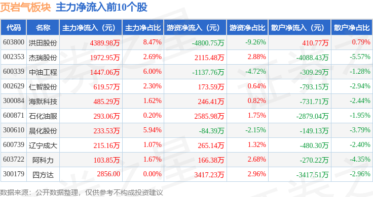 从资金流向上来看,当日页岩气板块主力资金净流出9.86亿元,游资资金净流入1.12亿元,散户资金净流入8.74亿元。页岩气板块个股资金流向见下表: