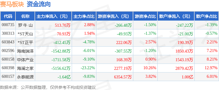 从资金流向上来看,当日赛马板块主力资金净流出2.46亿元,游资资金净流入8398.27万元,散户资金净流入1.62亿元。赛马板块个股资金流向见下表:
