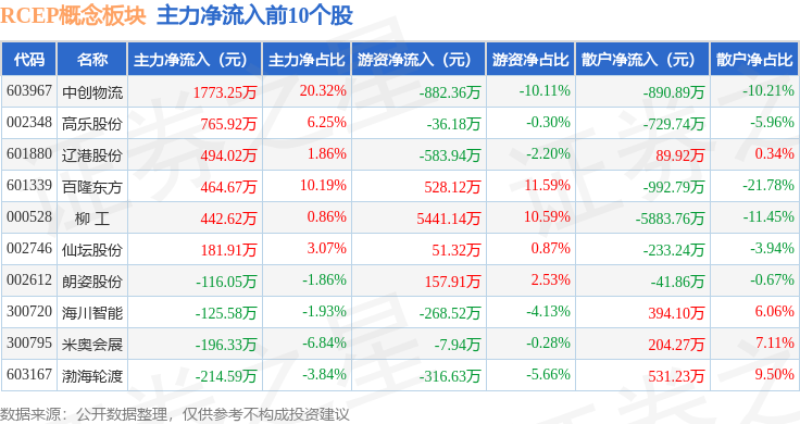从资金流向上来看,当日RCEP概念板块主力资金净流出8296.21万元,游资资金净流入4448.14万元,散户资金净流入3848.07万元。RCEP概念板块个股资金流向见下表: