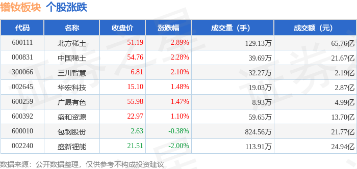 从资金流向上来看,当日镨钕板块主力资金净流出1222.29万元,游资资金净流出2560.84万元,散户资金净流入3783.13万元。镨钕板块个股资金流向见下表: