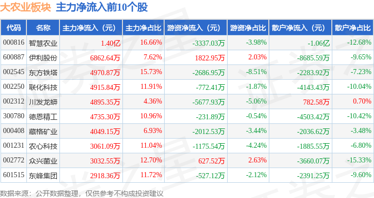 从资金流向上来看,当日大农业板块主力资金净流出3.2亿元,游资资金净流入1.51亿元,散户资金净流入1.69亿元。大农业板块个股资金流向见下表: