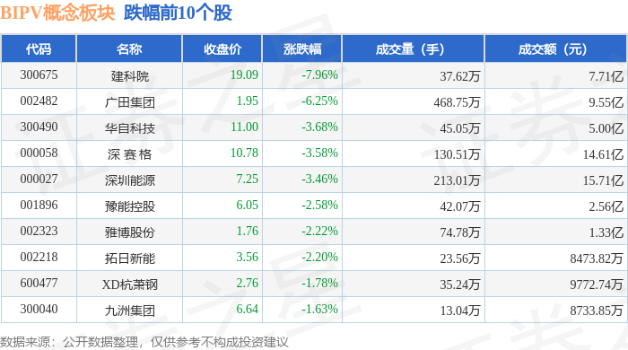 从资金流向上来看,当日BIPV概念板块主力资金净流出7.6亿元,游资资金净流入3.0亿元,散户资金净流入4.6亿元。BIPV概念板块个股资金流向见下表: