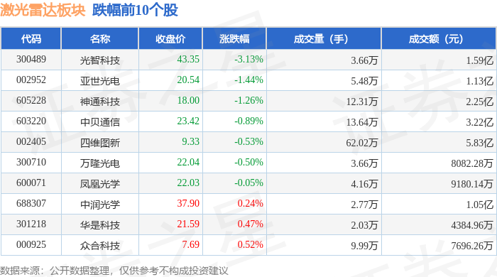 证券之星消息,10月24日激光雷达板块较上一交易日上涨5.74%,中际旭创领涨。当日上证指数报收于3950.31,上涨0.71%。深证成指报收于13289.18,上涨2.02%。激光雷达板块个股涨跌见下表: