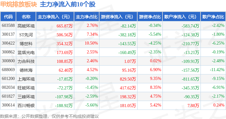 从资金流向上来看,当日甲烷排放板块主力资金净流出1.86亿元,游资资金净流入8298.89万元,散户资金净流入1.03亿元。甲烷排放板块个股资金流向见下表: