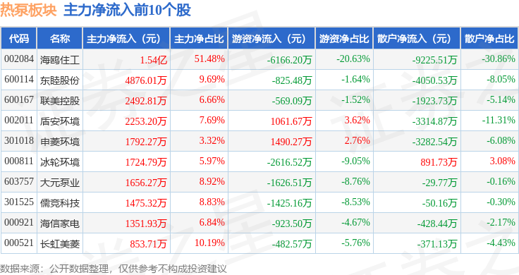 从资金流向上来看,当日热泵板块主力资金净流入2.38亿元,游资资金净流出1.25亿元,散户资金净流出1.13亿元。热泵板块个股资金流向见下表: