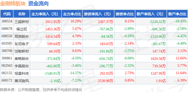从资金流向上来看,当日金刚线板块主力资金净流出1.79亿元,游资资金净流入3317.32万元,散户资金净流入1.46亿元。金刚线板块个股资金流向见下表: