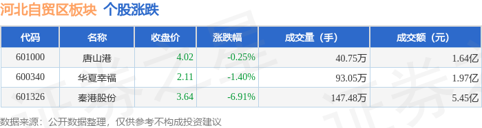 证券之星消息,10月24日河北自贸区板块较上一交易日下跌2.87%,秦港股份领跌。当日上证指数报收于3950.31,上涨0.71%。深证成指报收于13289.18,上涨2.02%。河北自贸区板块个股涨跌见下表: