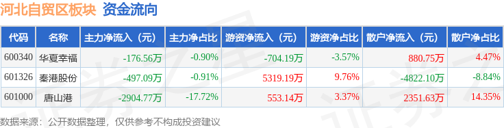 从资金流向上来看,当日河北自贸区板块主力资金净流出3578.43万元,游资资金净流入5168.14万元,散户资金净流出1589.72万元。河北自贸区板块个股资金流向见下表: