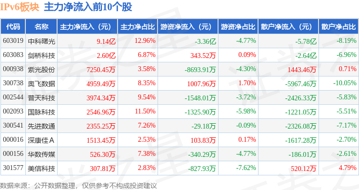 从资金流向上来看,当日IPv6板块主力资金净流入9.55亿元,游资资金净流出2.81亿元,散户资金净流出6.74亿元。IPv6板块个股资金流向见下表: