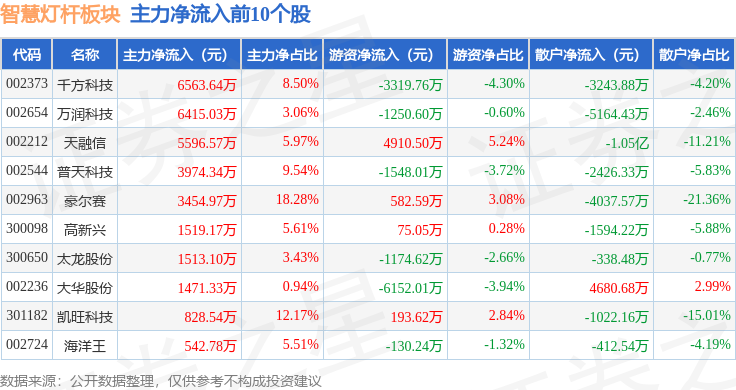 从资金流向上来看,当日智慧灯杆板块主力资金净流出4.78亿元,游资资金净流入1.08亿元,散户资金净流入3.7亿元。智慧灯杆板块个股资金流向见下表: