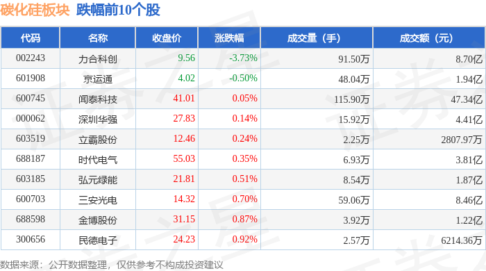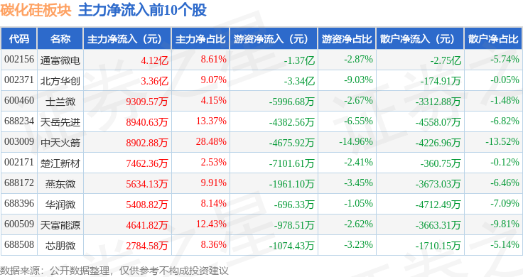 从资金流向上来看,当日碳化硅板块主力资金净流入9.22亿元,游资资金净流出9.02亿元,散户资金净流出1953.28万元。碳化硅板块个股资金流向见下表: